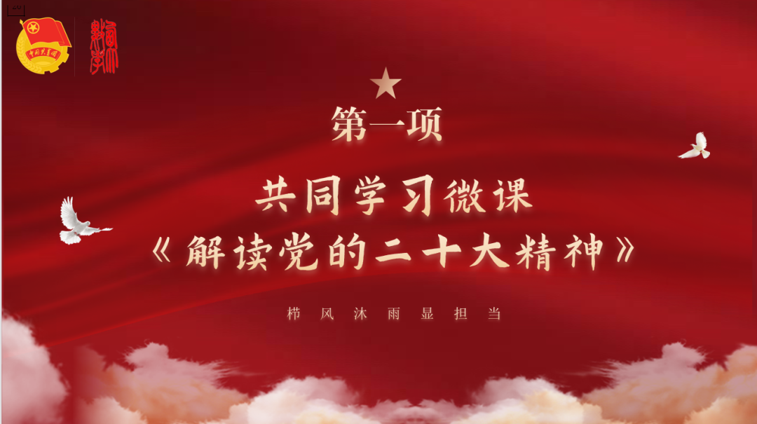 会议第二项,孙梦雪同学宣讲。学习部工作人员孙梦雪同学以《新时代新征程新绽放》为题进行了宣讲,分享了她对党的二十大精神的理解。新时代的十年,在党的坚强领导下,我们取得了一个个举世瞩目的伟大成就,现在站在新的历史起点上,我们要当好冲锋者,要不断砥砺奋进,创造更大辉煌!