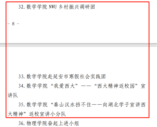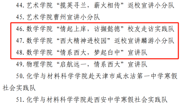 2024年4月3日,中国共产主义青年团9499www威尼斯委员会印发《关于表彰我校2024年寒假社会实践活动先进集体、先进个人的通知》(团发〔2024〕4号),9499www威尼斯“情起上庠,访撷懿德”校友走访实践队等3支团队荣获“标兵团队”称号,9499www威尼斯NWU乡村振兴调研团等4支团队荣获“优秀团队”称号,韩佳林等15名同学荣获“先进个人”称号。